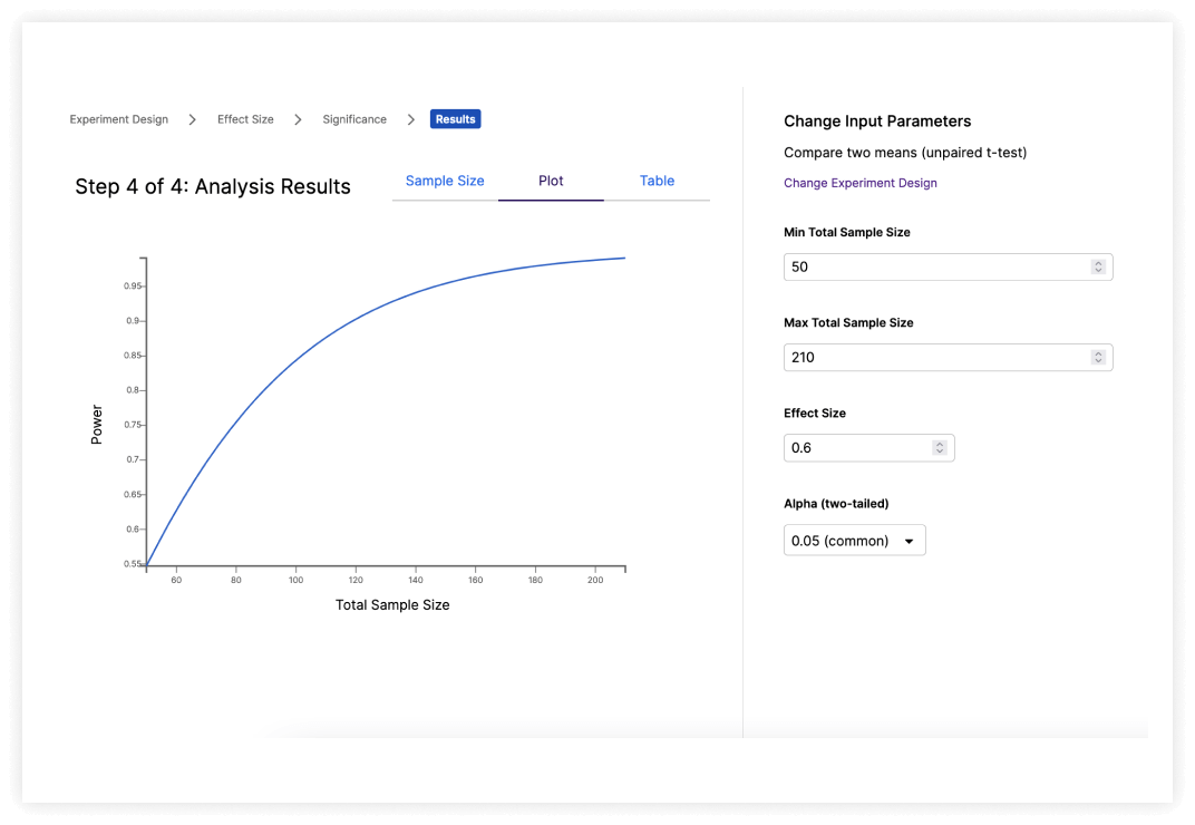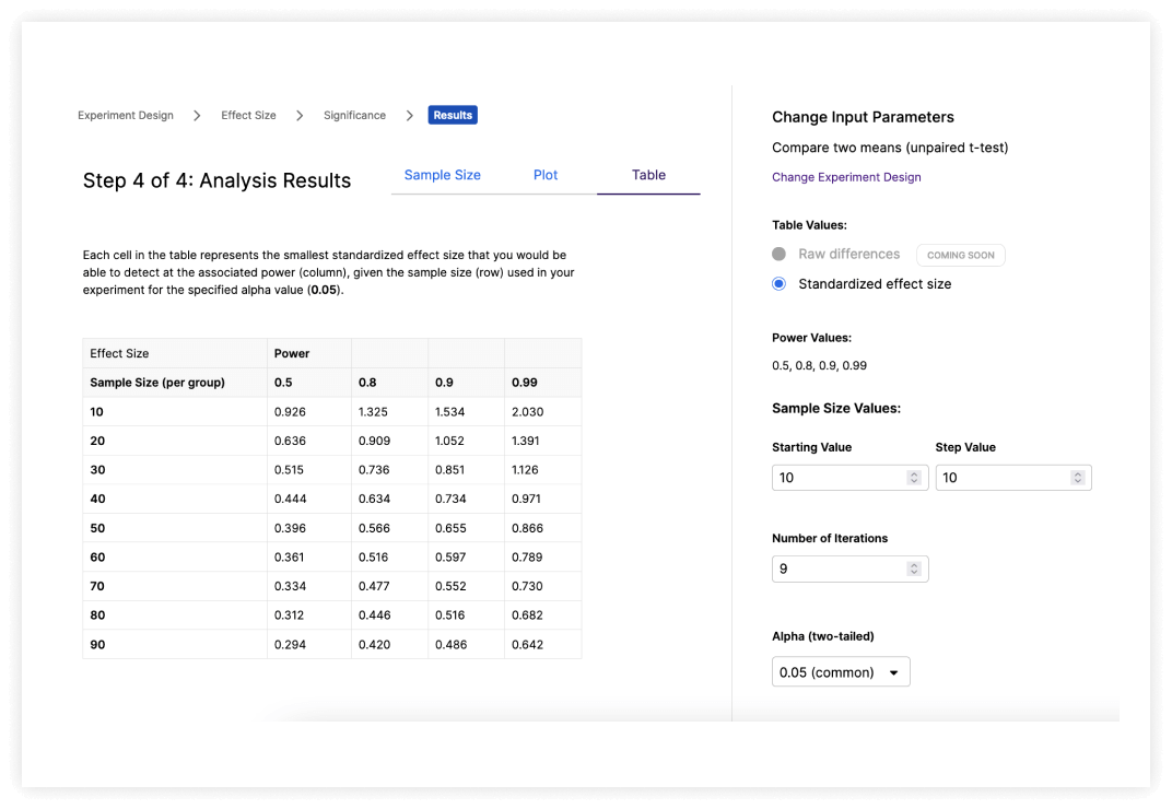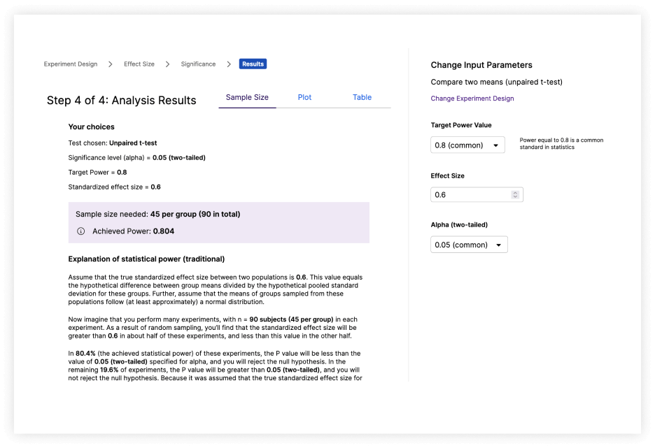 Fully adjustable parameters to calculate key values. Determine the sample size needed to detect a predicted effect size, or find the smallest detectable effect size when working with a limited sample size.