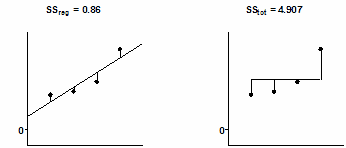 The left panel shows the best-fit linear regression line This lines minimizes the sum-of-squares of the vertical distances of the points from the line. Those vertical distances are also shown on the left panel of the figure. In this example, the sum of squares of those distances (SSreg) equals 0.86. Its units are the units of the Y-axis squared. To use this value as a measure of goodness-of-fit, you must compare it to something.