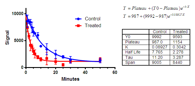 Another approach is to simply show the parameter values from the curve of best fit in tabular form. Copy selected results and then paste onto a graph. The table will be linked, so its values will change if you edit or replace the data. This doesn't show the form of the equation (exponential decay, in this example) but gives you the results of this particular experiment, which may be more important.