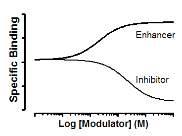 Fits a curve of "competition" of binding by an allosteric modulator, based on the ternary complex model. Note that this model assumes the allosteric modulator is present in excess, so is not depleted by binding to the receptors. Since it binds to a different site than the radioligand, the term 'competition' is not apt, but we list it here because the experimental design is the same as used for competitive binding.