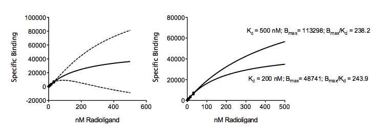 The problem is that the data are consistent with a system with a huge number of low affinity receptors (high Bmax; high Kd) or a smaller number of high affinity receptors (low Bmax; low Kd). The figure below shows two ways the visualize this. The graph on the left shows the same fit as the one above, but with the best-fit curve and its confidence bands extended out to larger concentrations. While the confidence band is tight near the points, is it super wide as it goes beyond concentrations with data. The graph on the right show two different fits, with the Kd constrained to equal 200 nM or 500 nM. The curves are very different, yet both go near the data.