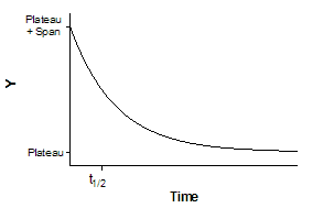 Y may be concentration, binding, or response. Y starts out equal to SPAN+PLATEAU and decreases to PLATEAU with a rate constant K.