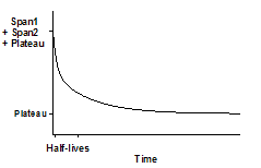 This equation describes a two phase exponential decay. Y starts out equal to Span1+Span2+PLATEAU and decays to PLATEAU with fast and slow components. The two half-lives are 0.6932/K1 and 0.6932/K2. In the figure, the two rate constants differ tenfold, but the spans were equal. The curve is not obviously biphasic, and it takes a very practiced eye to see that the curve does not follow a single phase model.