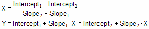 If the P value is low, Prism concludes that the lines are significantly different. In that case, there is no point in comparing the intercepts. The intersection point of two lines is: