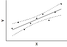 Prism can also plot the 95% prediction bands. The prediction bands are further from the best-fit line than the confidence bands, a lot further if you have many data points. The 95% prediction band is the area in which you expect 95% of all data points to fall. In contrast, the 95% confidence band is the area that has a 95% chance of containing the true regression line. This graph shows both prediction and confidence intervals (the curves defining the prediction intervals are further from the regression line).