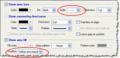 To adjust the appearance of the confidence or prediction bands, go to the Format Graph dialog, select the dataset that represents the regression line, and adjust the error bars and area fill settings. You can also choose to fill the area enclosed by the confidence or prediction bands.