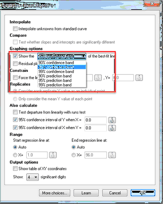 If you check the option box on the top of the Simple linear regression parameters dialog, Prism will calculate and graph either the 95% confidence band or 95% prediction band of the regression line.