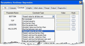 Prism lets you constrain each parameter to a constant value, constrain to a range of values, share among data sets (global fit), or define a parameter to be a column constant. This is an important decision, and will influence the results.
