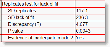 If the model is correct, and all the scatter is Gaussian random variation around the model, then the two SD values will probably be similar, so F should be near 1. In this example, F is greater than 1 because the SD for lack of fit is so much greater than the SD of replicates. The P value answers this question: