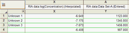From the Welcome or New Table dialog, choose to create an XY data table, and select the sample data set: RIA or ELISA. Interpolate unknowns from sigmoidal curve.