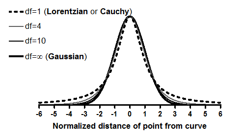 Based on a suggestion in Numerical Recipes (1), we based our robust fitting method on the assumption that variation around the curve follows a Lorentzian distribution, rather than a Gaussian distribution. Both distributions are part of a family of t distributions: