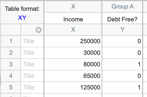 If you would like to see how Prism works on a sample data set, choose the sample data: Simple logistic regression. Otherwise, if you want to enter your own data, be sure that the Y values are binary and encoded as strictly 0s and 1s. Prism will not perform simple logistic regression (or multiple logistic regression) if your outcome variable is not encoded as 0s and 1s (read more about binary outcome variables).