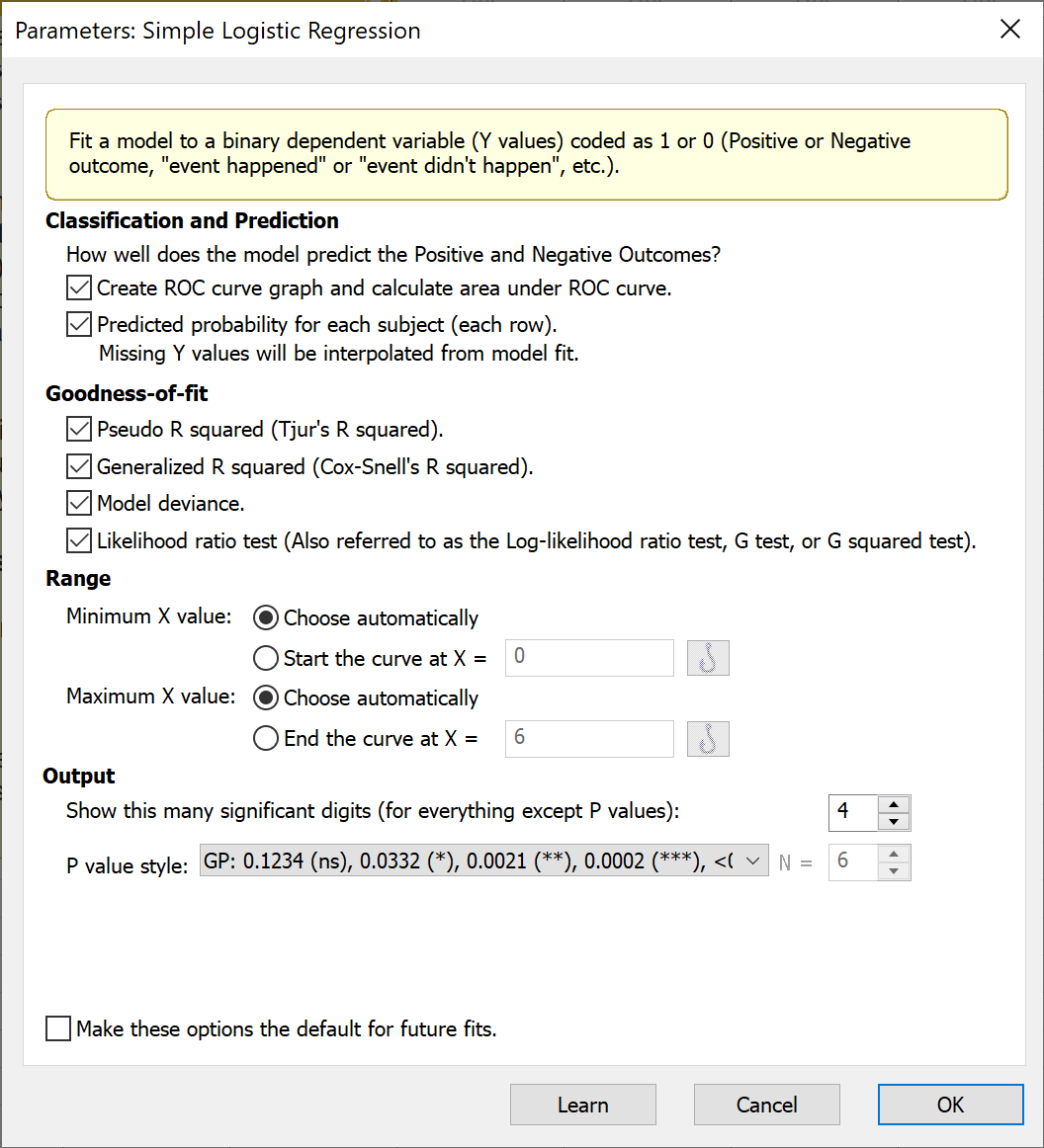A logistic plot is automatically generated when you perform simple logistic regression. You can allow Prism to choose the default minimum and maximum X values for plotting this curve based on your data, or you may choose to increase or decrease these limits as you choose.