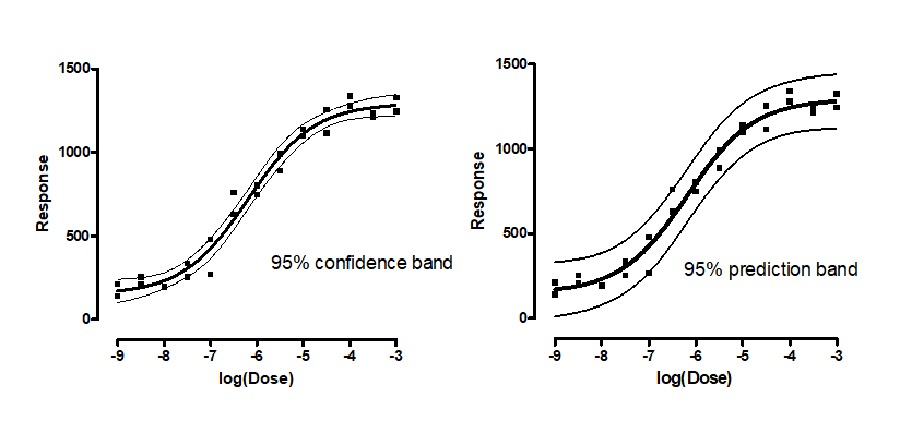 •If the results of nonlinear regression are ambiguous, the confidence or prediction bands would be super wide, maybe infinitely wide. They would not be useful, so Prism does not plot them.