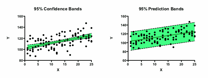 Prediction bands show you where you can expect the data to lie. You expect 95% of all data points to lie within the prediction bands.