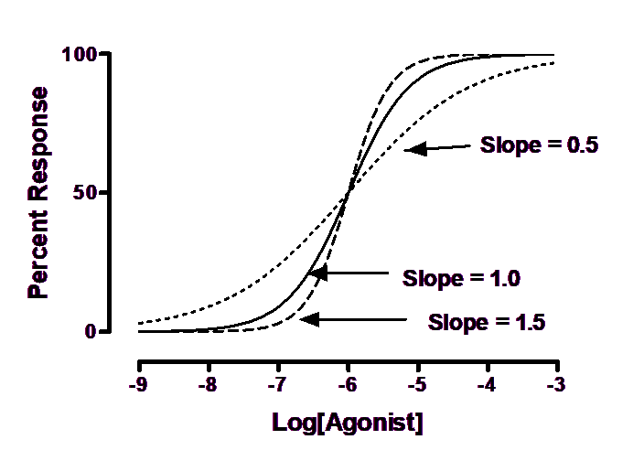 Some dose-response curves are steeper or shallower than the standard curve. The steepness is quantified by the Hill slope, also called a slope factor. A dose-response curve with a standard slope has a Hill slope of 1.0. A steeper curve has a higher slope factor, and a shallower curve has a lower slope factor.