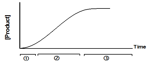 In most cases, an enzyme converts one chemical (the substrate) into another (the product). A graph of product concentration vs. time follows three phases marked on the graph below.