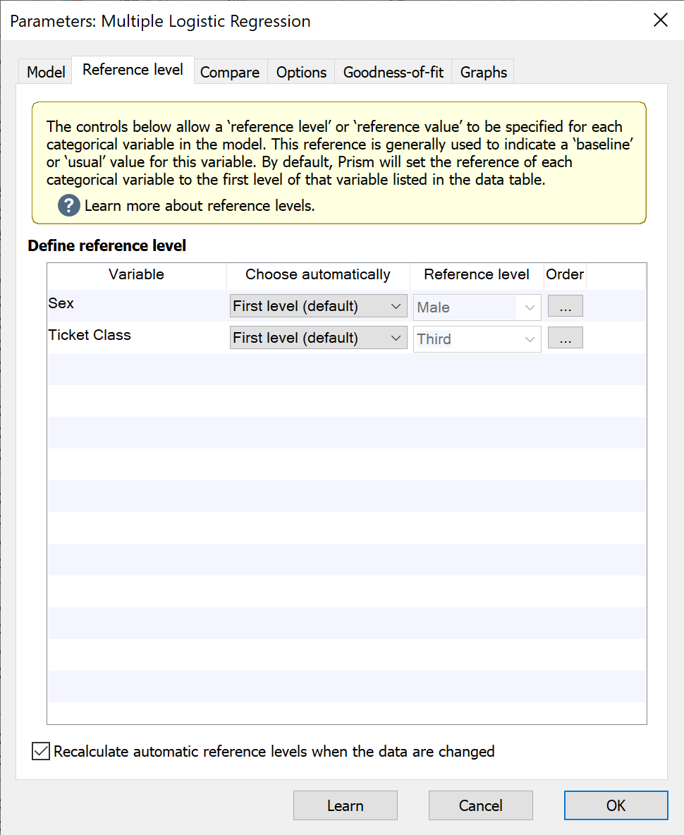 By default, the reference level for a categorical variable is selected to be the first level of that variable in the data table. Prism also offers other automatic choices including "Last level", "Most frequent level", and "Least frequent level". However, if the input data are changed (or if additional data are added to the input data table), some of these automatic choices may also change. To ensure that a specified reference level does not change when the input data are changed or additional data is added, either uncheck the box beside "Recalculate automatic reference levels when the data is changed" or set the individual reference levels to "Custom..." using the appropriate dropdown menu.