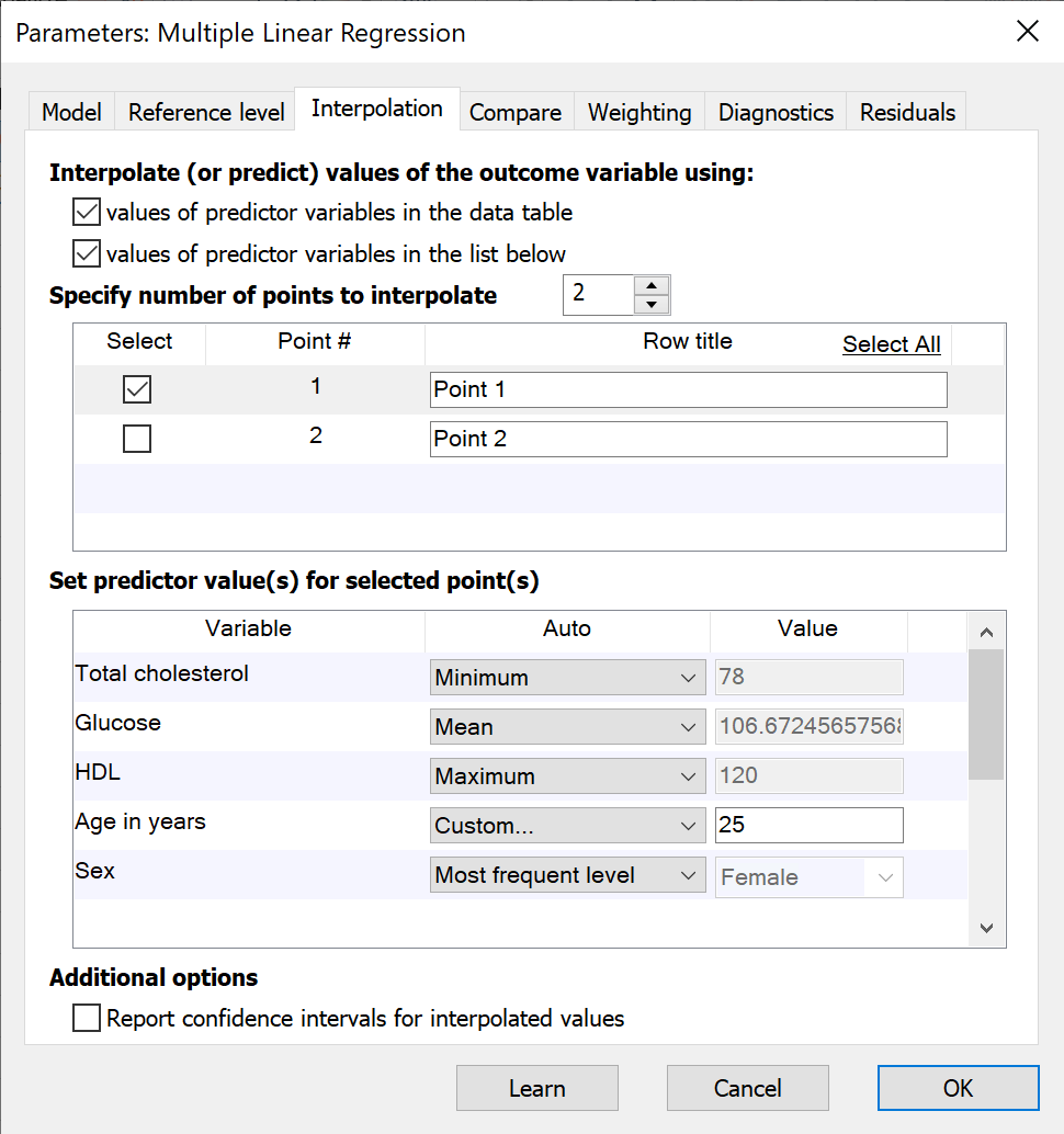 Like simple linear regression and nonlinear regression, Prism also allows for interpolation from multiple linear regression. Using the specified model for multiple regression and the best-fit parameter coefficient, Prism can interpolate values for the outcome variable in two different ways: from points in the input data table and using specified points on the Interpolation tab.