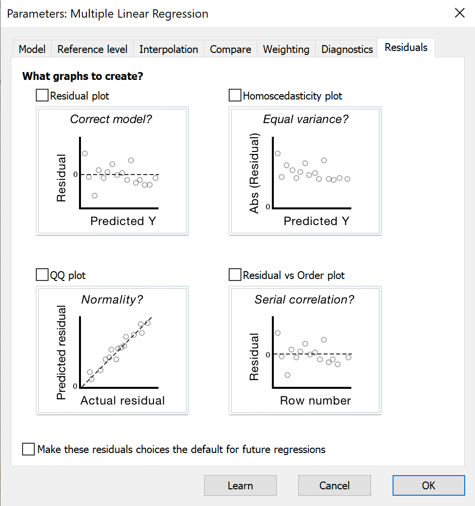 •The residual plot is used most often. For each row of data, Prism computes the predicted Y value from the regression equation and plots this on the X axis. The Y axis shows the residual. If the data follow the assumptions of multiple regression, you shouldn't see any clear trend. The size of the residuals should not be related to the predicted Y values.