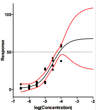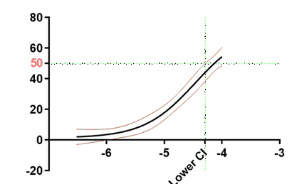 •The input value for Y falls out of the vertical range of the standard curve. This happens when you fit a sigmoidal log(dose) vs response curve. If you enter an unpaired Y value that is larger than the best-fit value of Top, or smaller than the best-fit value of Bottom, there simply is no corresponding X value, and Prism will simply leave that part of the Results sheet blank. Note that "top" and "bottom" apply to the best-fit values for those fitted parameters, not the maximum and minimum values of the input data. It simply is impossible to interpolate a X value if the Y value is too high, or too low, to be on the curve.