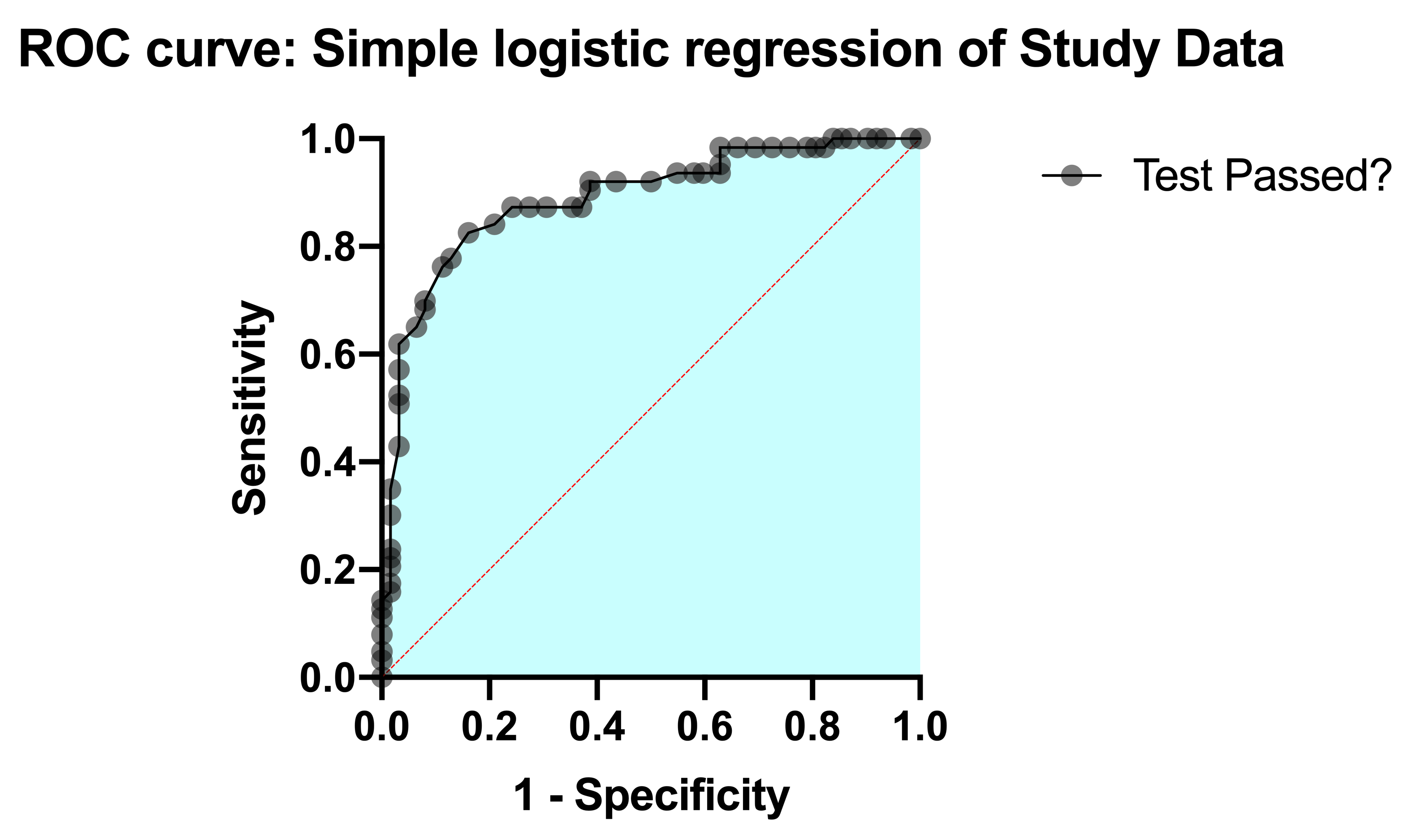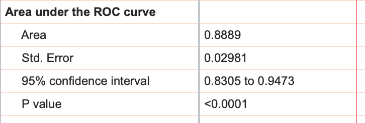 The area under the ROC curve (AUC) is a measure of how well the fit model correctly classifies successes/failures. This value will always be between 0 and 1, with a larger area representing a model with better classification potential. In our case, the AUC for the the ROC curve (depicted below) is 0.8889, and is listed in the results table along with the standard error of the AUC, the 95% confidence interval, and P value (null hypothesis: the AUC is 0.5). Read more about ROC curves for logistic regression for even more information and some of the math involved.
