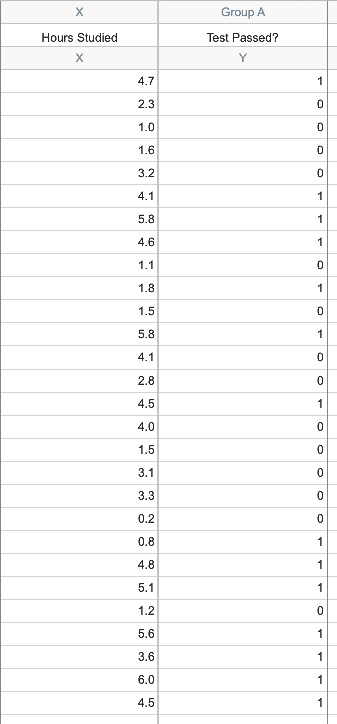 For the purposes of this walkthrough, we will be using the Simple logistic regression sample data found in the "Correlation & regression" section of the sample files. To use this data, click on "Simple logistic regression" in the list, and then click "Create". You will then be shown a set of data with two columns: "Hours Studied" in the X column and "Test Passed?" in the Y column.