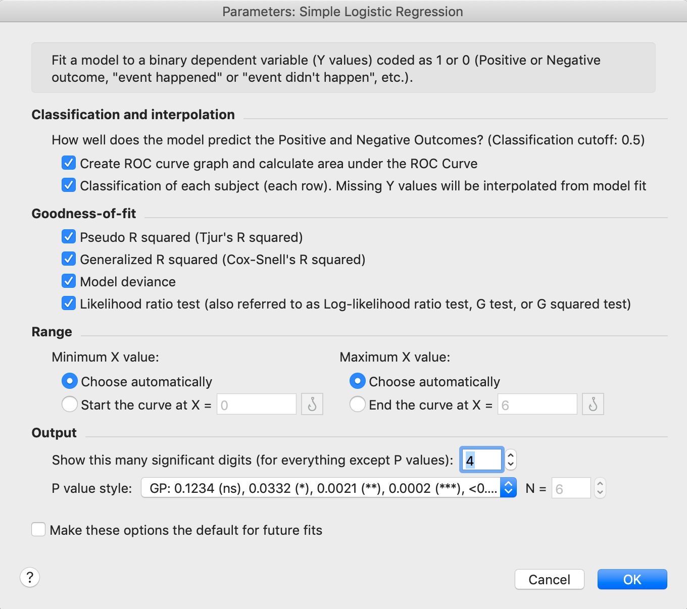 In the final section of calculated results, Prism provides some additional metrics that attempt to summarize how well the model fits the given data. The first two of these are Tjur's R squared and Cox-Snell's R squared, and while "R squared" may be in their name, these metrics simply cannot be interpreted in the same way that R squared for linear and nonlinear regression is interpreted. Instead, these values are known as pseudo R squared values, provide different kinds of information about the model fit. For these metrics, the calculated value will be between 0 and 1, with higher values indicating a better fit of the model to the data.