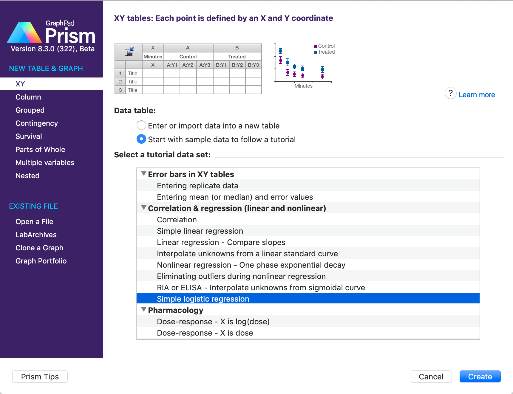 This guide will walk you through the process of performing simple logistic regression with Prism. Logistic regression was added with Prism 8.3.0