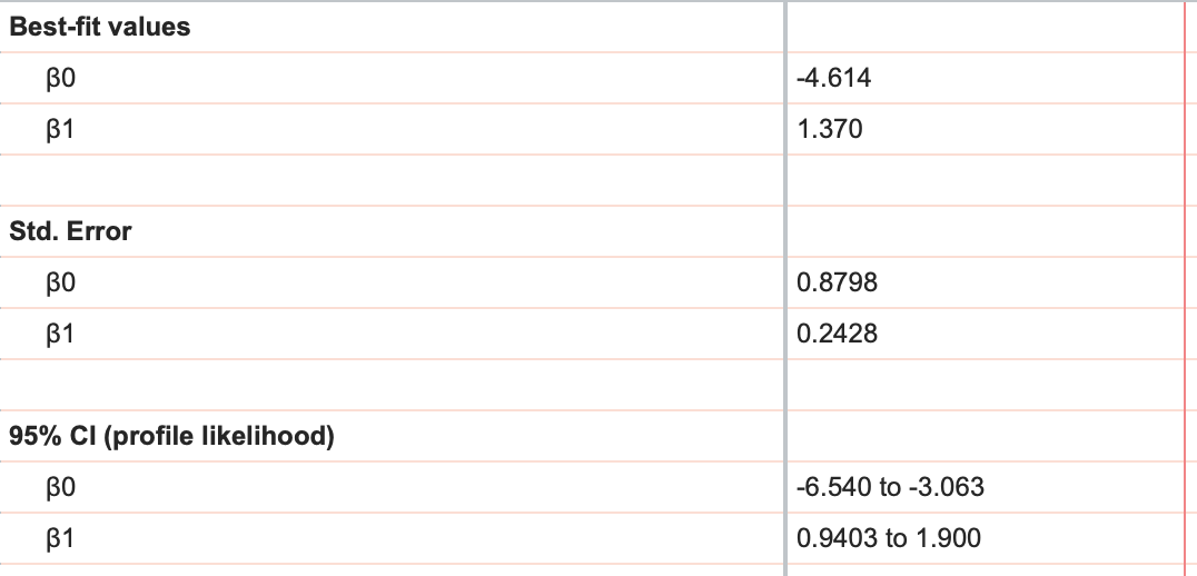 The first thing that you'll see on the results sheet are the best fit value estimates along with standard errors and 95% confidence intervals for both β0 and β1.