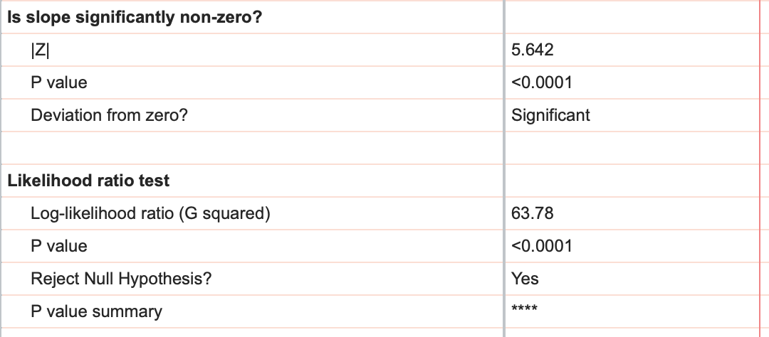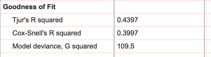 If we click back to the "Tabular results" tab of the results sheet, we can continue investigating the other results reported by simple logistic regression. The next section of the results provides two different ways to test how well the model fits the data. While these tests are quite similar, it's important to understand how each of them work and the hypothesis that each are testing to interpret the results.