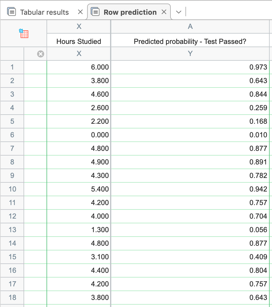 If we switch back to the main results sheet for simple logistic regression, you'll see at the top a sheet tab titled "Row prediction". When clicking on this tab, Prism will provide a complete list of predicted probabilities for all entered X values: