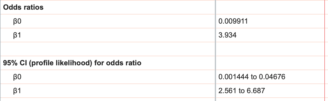 Because it is hard to directly interpret β0 and β1, it's common to look instead to the odds ratios and their 95% confidence intervals (reported farther down on the results sheet).
