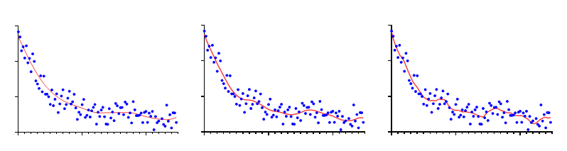 Prism also can now plot smoothing splines. You decide the degree of smoothness by specifying the number of knots. This example shows splines with 3, 5, and 7 knots. Since the splines were derived for art (computer animation) the choice of how many knots to allow is yours to make artistically. Splines have nothing to do with data analysis.