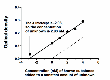 The dotted line in the figure below shows how the assay results (usually optical density) varies as you change the concentration of the substance you are assaying. The circles and solid line show the assay results in the presence of an unknown concentration of the substance you are assaying. This pushes the line up and to the left.