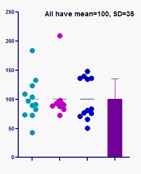 The figure below shows three sets of data, all with exactly the same mean and SD. The sample on the left is approximately Gaussian. The other two samples are far from Gaussian yet have precisely the same mean (100) and standard deviation (35).