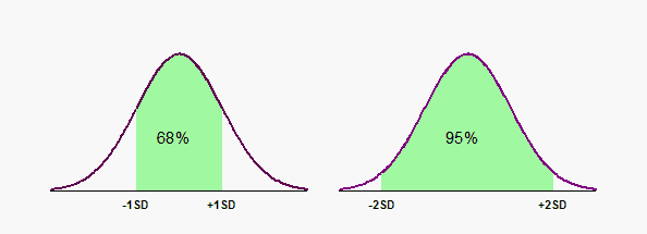 The graph that follows shows the relationship between the standard deviation and a Gaussian distribution. The area under a probability distribution represents the entire population, so the area under a portion of a probability distribution represents a fraction of the population. In the graph on the left, the green (shaded) portion extends from one SD below the mean to one SD above the mean. The green area is about 68% of the total area, so a bit more than two thirds of the values are in the interval mean plus or minus one SD. The graph on the right shows that about 95% of values lie within two standard deviations of the mean.
