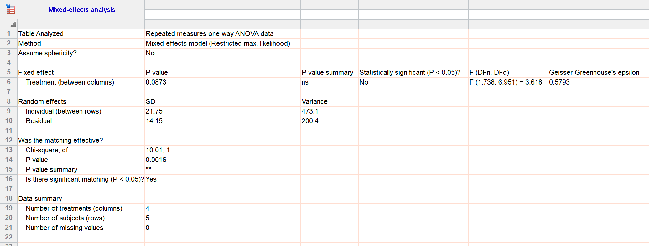 The main result is the P value that tests the null hypothesis that all the treatment groups have identical population means. That P value is 0.0873 by both methods (row 6 and repeated in row 20 for ANOVA; row 6 for mixed effects model). For these data, the differences between treatments are not statistically significant.