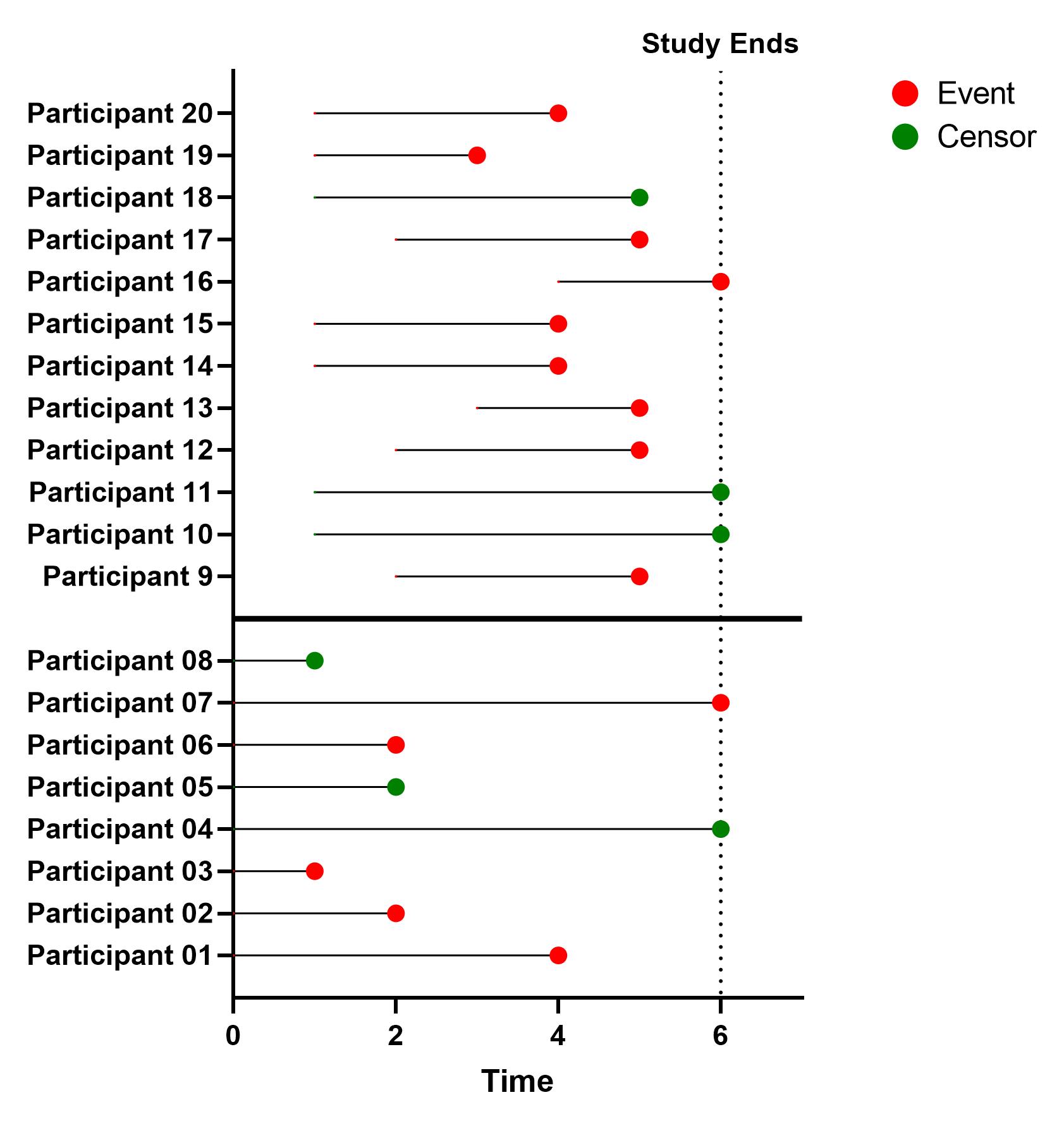 The graph below shows a timeline for each of the original 8 participants in the study, along with an indication of whether or not they died (event) or were censored.