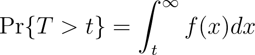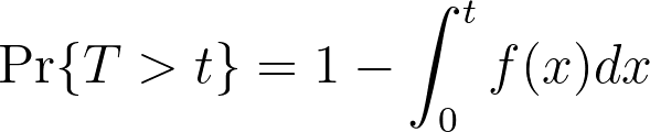 In other words, F(t) gives the probability that the observed elapsed time T is less than the specific time t being evaluated in the expression. However in survival analysis, we’re generally not interested in the probability that the event has occurred by a specific time. Rather, we would like to know the probability that the event has not occurred by a specific time. We can use a few of the facts presented earlier about the pdf and the cdf to give this mathematical form.
