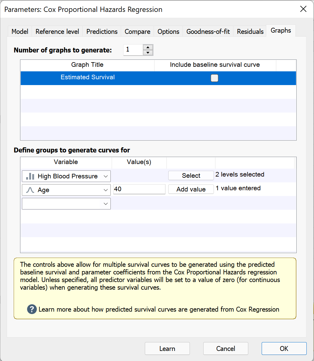 Before we click “OK”, we will switch to the Graphs tab. The controls on this tab are used to generate estimated survival curves for different groups represented by the predictor variables in the specified model. The two sections of controls on this tab are used to: