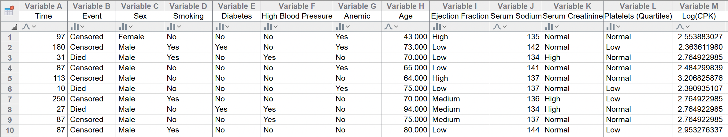 Choose the Cox proportional hazards regression sample data found in the list of tutorial data sets for the multiple variables data table. An excerpt of the data is shown below: