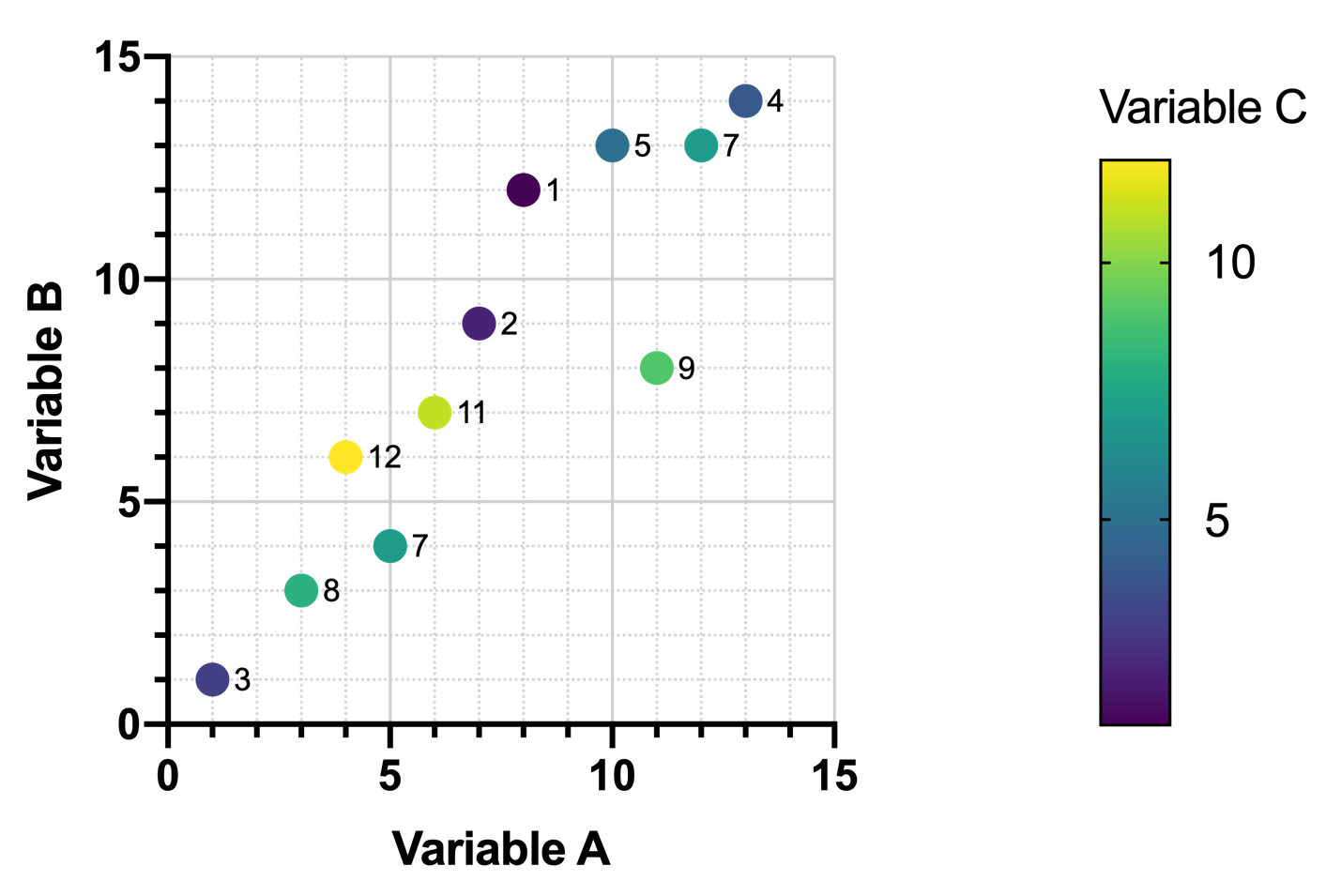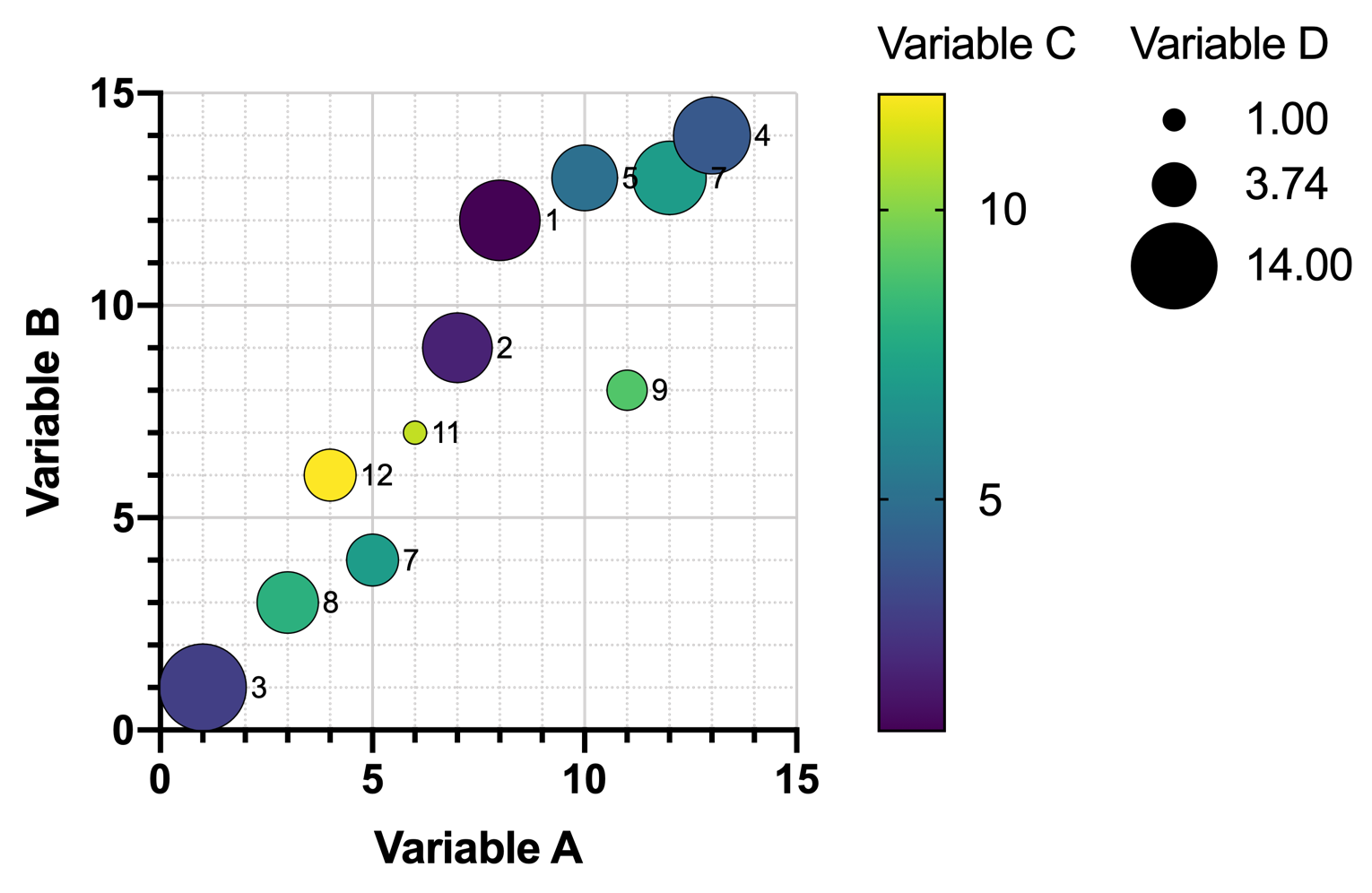 An additional variable could be added to this graph, using its values to determine the symbol size. In the graph (below), symbol size is proportional to the value of Variable D. However, as the number of rows in the data increase, these kinds of graphs become even harder to read, and relationships certainly do not jump out at you.