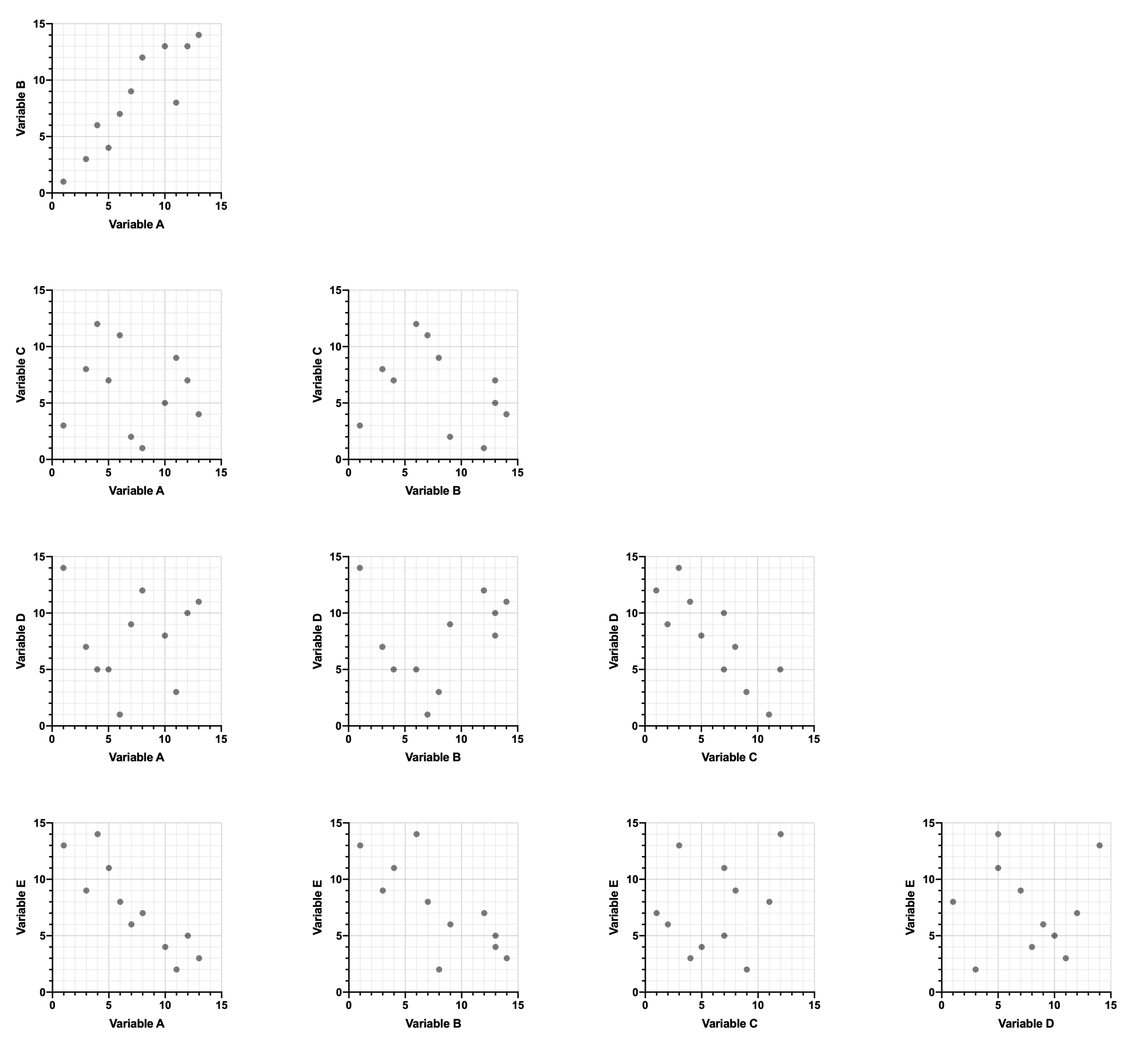 If the dataset includes a large number of variables, it becomes nearly impossible to represent all of the variables on a single graph. Graph matrices can be used to show the relationships between each pair of variables (see below), but these provide very little insight into larger potential relationships involving multiple variables at once.