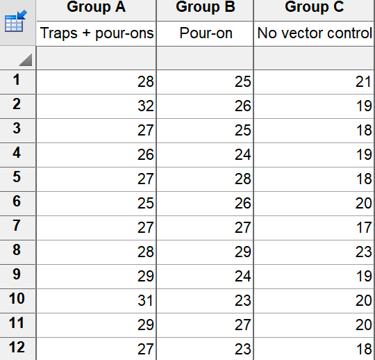 This example comes from the excellent on-line statistics text titled How to Avoid and Detect Statistical Malpractice. The study assesses the effect of two methods of disease vector control versus no control on the packed cell volume (PCV) of cattle. Three herds of cows are randomly assigned to each of the three treatments. Blood samples are taken from four cows from each herd, and packed red cell volume is tabulated.