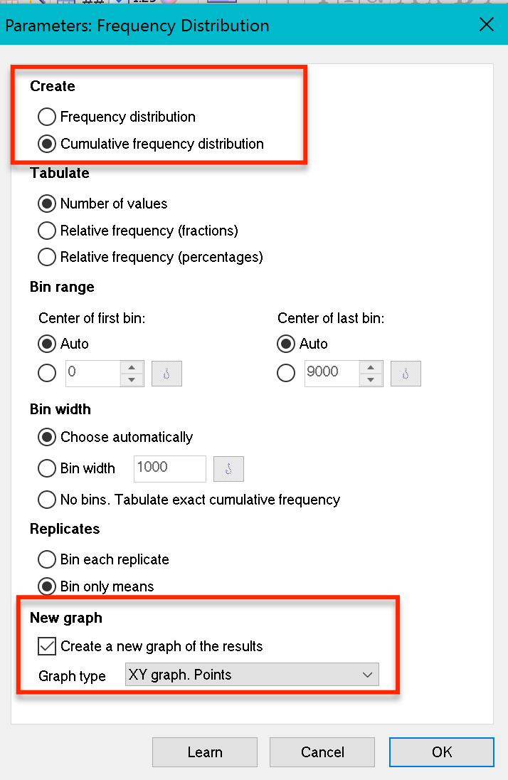 1.In the frequency distribution dialog, choose to create the cumulative frequency distribution. Also choose to plot the data as an XY graph of points.