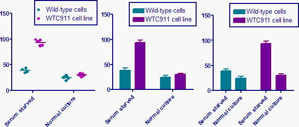 The graph on the left has the appearance set as a column dot plot. The other two graphs have the appearance set as bars with error bars plotted from the mean and SD. I prefer the column dot plot as it shows all the data, without taking up more space and without being harder to interpret. If you have a huge number of replicates, use a violin plot instead.