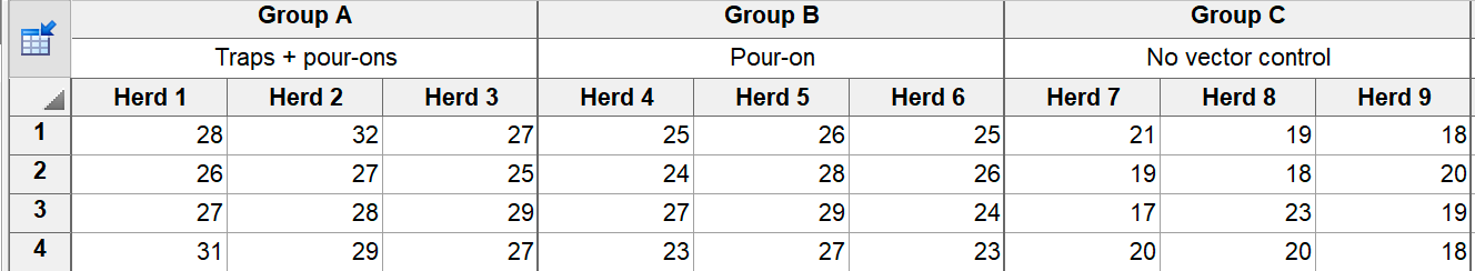 Create a Nested table, and set it up the number of subcolumns corresponding to the number of actual replicates you have. In the example, there are three herds in each treatment group, so create the table with three subcolumns.