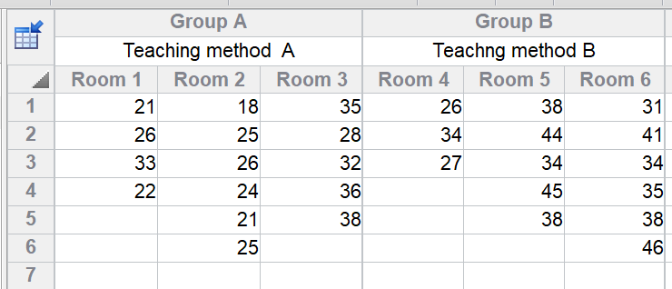 If you are not using the tutorial data, create a Nested table, and set it up the number of subcolumns corresponding to the number of actual replicates you have. In the example, there are three rooms used for each teaching method, so create the table with three subcolumns.
