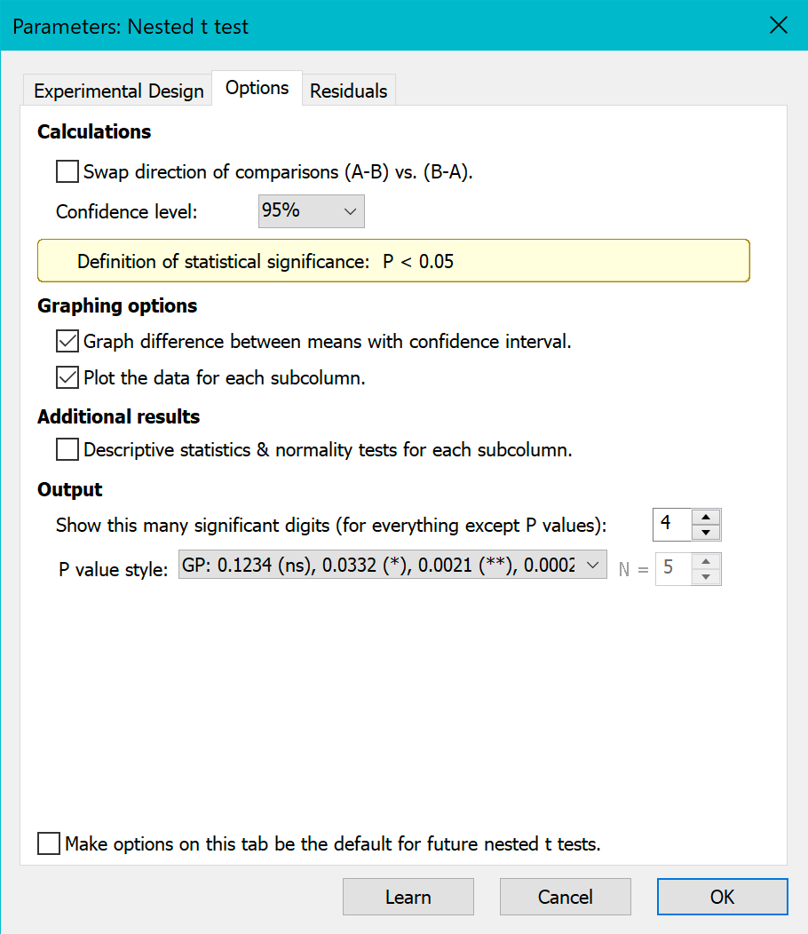 •Prism cannot run the nested t test with huge data sets and presents an message telling you so. How huge is huge? Details here.